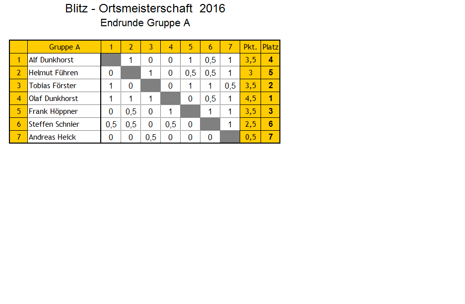 Am letzten Freitag (22.4.) fand die Blitz-OM bei den Erwachsenen statt. Bei einer sehr guten Beteiligung von 16 Personen konnte sich Olaf Dunkhorst vor Tobias Förster und Frank Höppner durchsetzen. Für Olaf war es der 50. Vereinsturniersieg!