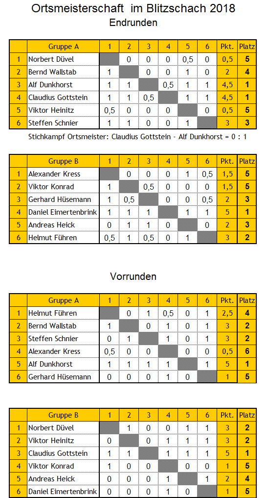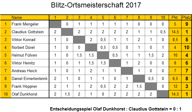 Am letzten Freitag (22.4.) fand die Blitz-OM bei den Erwachsenen statt. Bei einer sehr guten Beteiligung von 16 Personen konnte sich Olaf Dunkhorst vor Tobias Förster und Frank Höppner durchsetzen. Für Olaf war es der 50. Vereinsturniersieg!